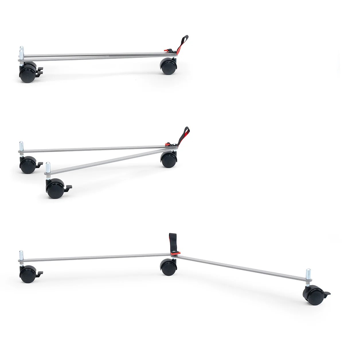 Fahrbares, pulverbeschichtetes Aluminium-Untergestell mit 3 Rollen, von denen 2 feststellbar sind.