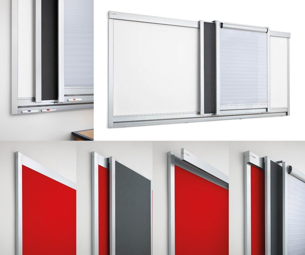 Schlichte Eleganz, formschön, zeitlos und äußerst praktisch – so präsentiert sich das neue Schiebetafelsystem aus der Neuland LW-Linie. In den Schienen gleiten die Tafeln beinahe geräuschlos über die obere Laufschiene. Die untere Distanzschiene ist mit einer Stiftablage versehen, so dass Marker stets in Griffnähe liegen. Die gesamte Wandfläche ist als Pinfläche ausgeführt.