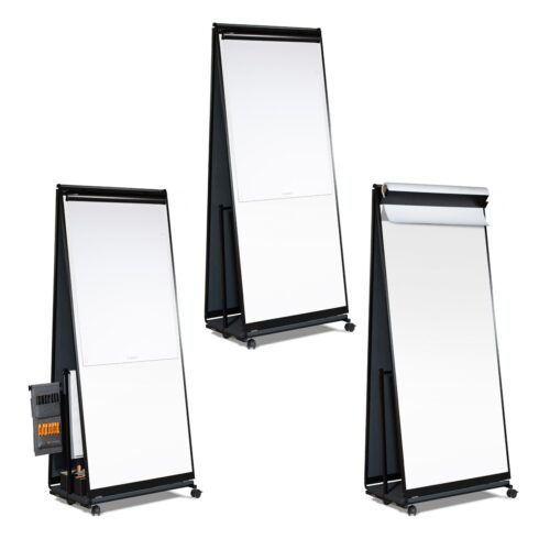 Auf dem Rollengestell das zugleich als Materialwagen für Stifte, Papier und Zubehör dient, begleiten dich die Tafeln flexibel durch den Raum.