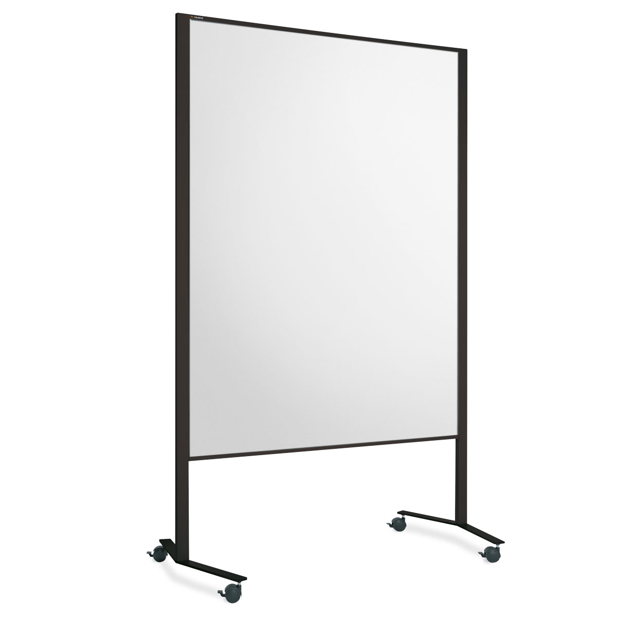 Dank der mattschwarzen Pulverbeschichtung kommt die klare Linienführung der fahrbaren Kombination aus Pinnwand und Whiteboard noch mehr zur Geltung: zeitlos, geradlinig und ohne Schnörkel. Nahtlos gehen die Standbeine in die breiten Seitenprofile des Rahmens über. Die flachen Stahl-Füße sind mit Lenkrollen ausgerüstet und V-förmig am Bein angebracht. So können Sie schnell von einer Stelle zur anderen bewegt und in Formationen aufgestellt werden. Die Füße können zum Transport abgenommen werden.